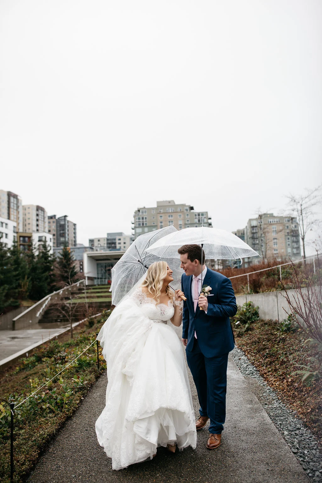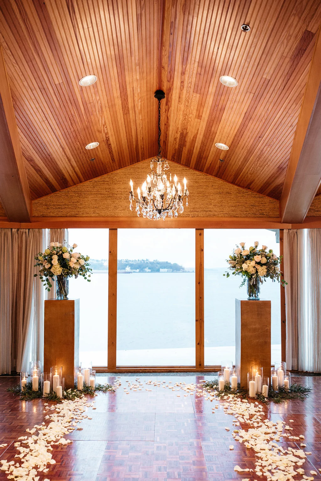 Ryan and Ali didn't let a little Seattle rain get in the way of their gorgeous photo session before the ceremony. Guests arrived to the stunning view of Elliot Bay framed by the floor to ceiling windows encircling the Edgewater Hotel's Olympic Ballroom.