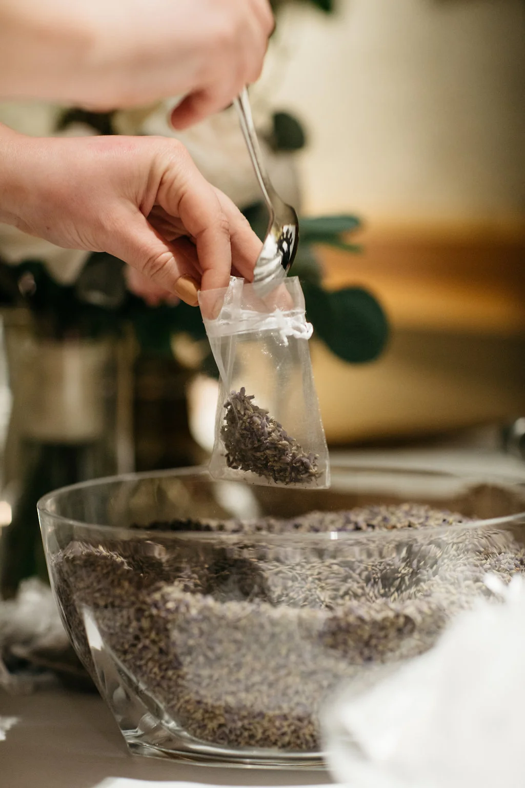 Guests were invited to create their own lavender sachets made up of lavender grown in the groom's hometown of Sequim, WA, and take home mints from the bride's hometown of Chehalis, WA.