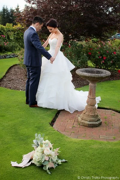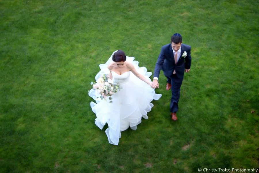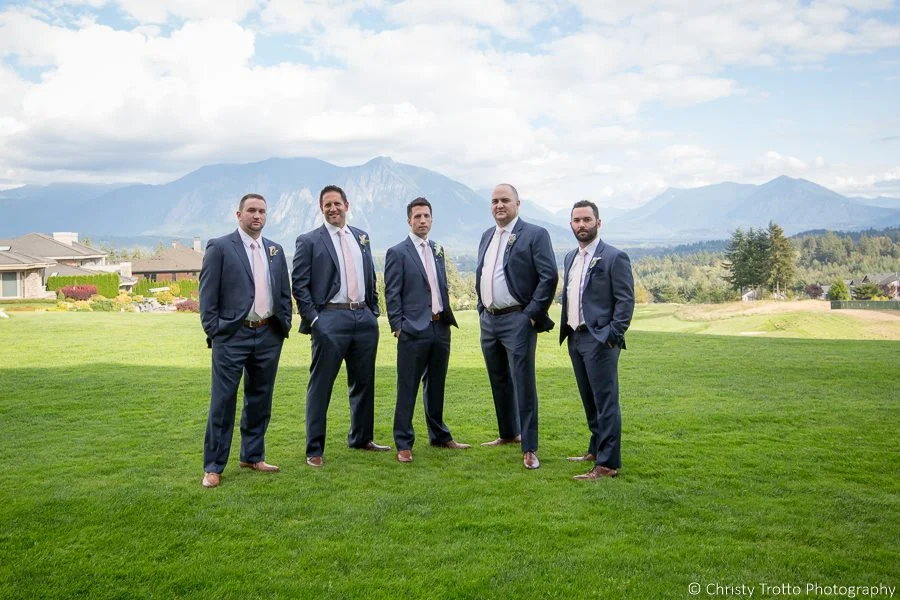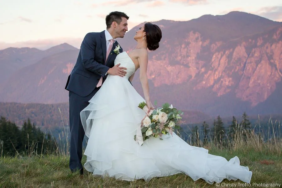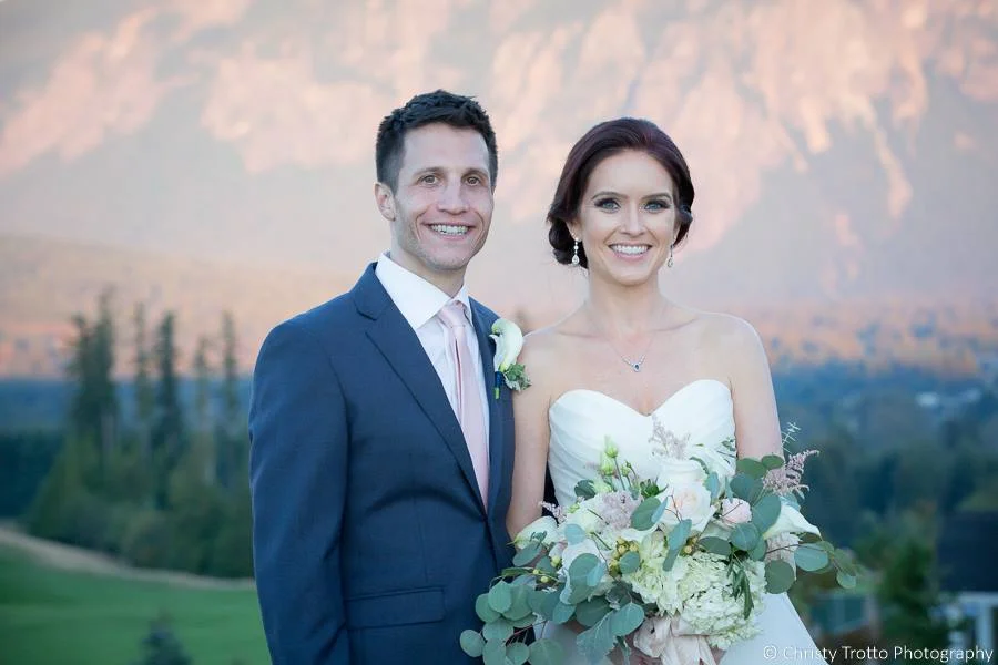 When you have your wedding at the base of a mountain range, you never know what the weather might be. But this late summer wedding was absolute perfection! Just enough clouds to make the background of Mount Si absolutely stunning and a view that went on for miles. Jaimie and Steven married under a traditional Chuppah. The rabbi that married Jaimie's parents came out of retirement to perform the ceremony for Jaimie & Steven. The pale pinks and light green in the floral arrangements complemented the space and feel of the wedding perfectly. Dancing started with the Horah and went into the late night with everyone having a great time.