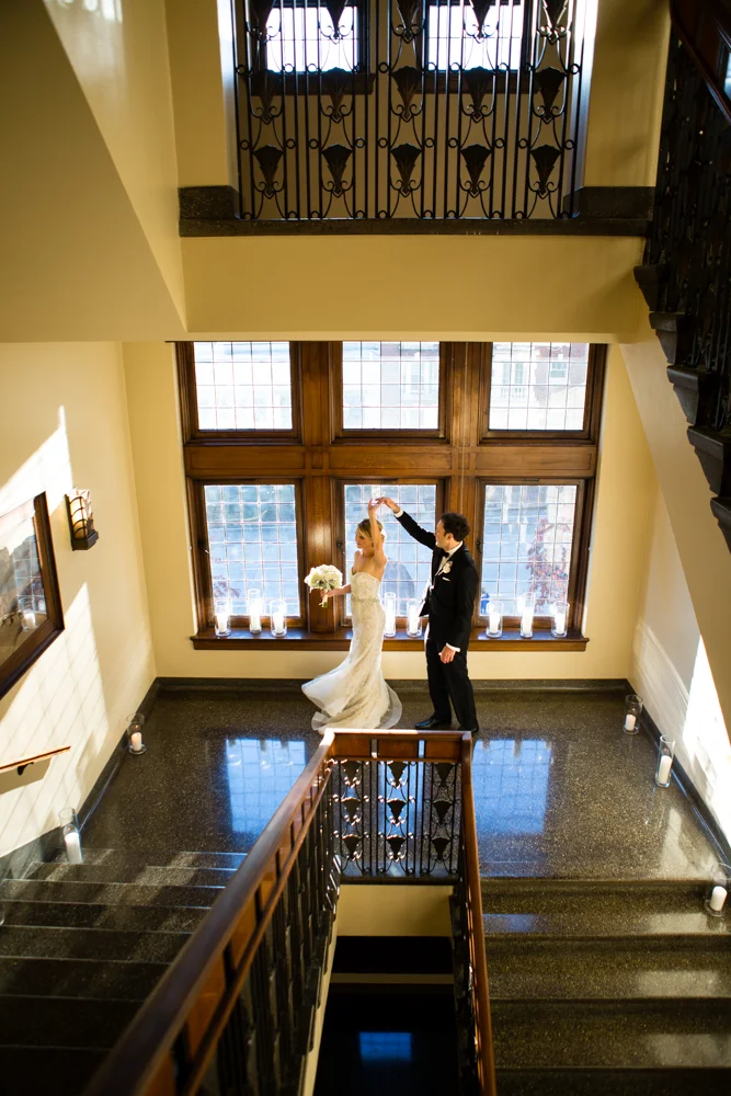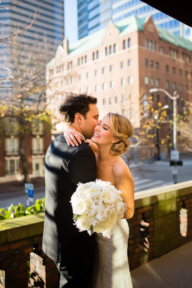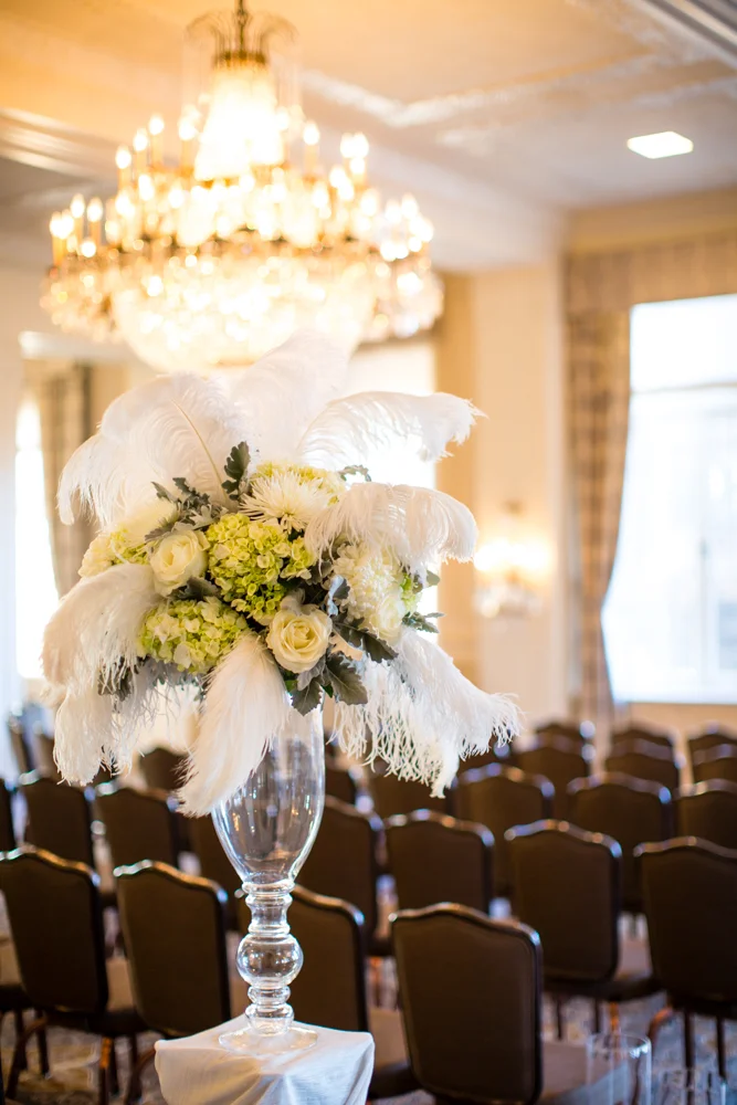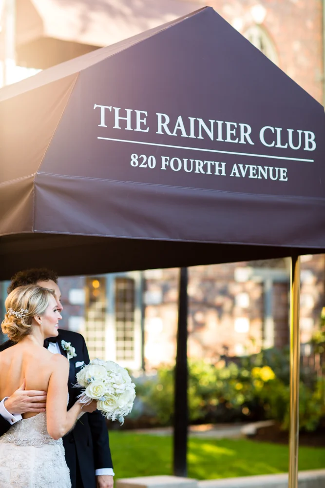 Kate was a bridesmaid in almost a dozen weddings we had planned over the years so when she became engaged to Bjorn, we received the call and of course were thrilled to help with their wedding. The Rainier Club's gold leaf ceilings, crystal chandeliers and elegant staircase were the perfect accents for this Gatsby inspired wedding. The use of soft white feather plumes & crystals in the floral arrangements kept with this theme. A champagne tower started the reception off in style and a streamer exit was the perfect end of the night for this elegant couple.